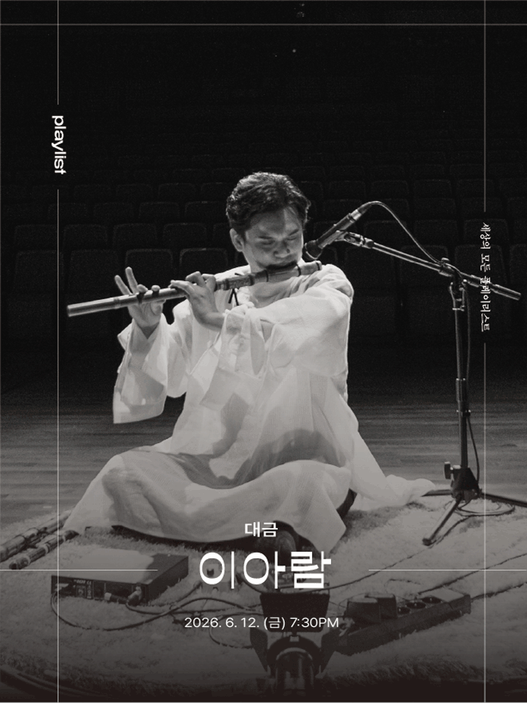 [Program] Gyeokrimjagyu (Daegeum Lee A-ram) Seo Yong-seok Style Daegeum Sanjo (Daegeum Lee A-ram / Janggu Jo Han-min) The Wind Has Many Names (Geomungo Kim Min-young / Janggu Jo Han-min) Yangnyuga (Daegeum Lee A-ram / Janggu Jo Han-min) Traveler of the Wind (Daegeum Lee A-ram / Janggu Jo Han-min) Their Path (Tungso Lee A-ram / Geomungo Kim Min-young / Janggu Jo Han-min)