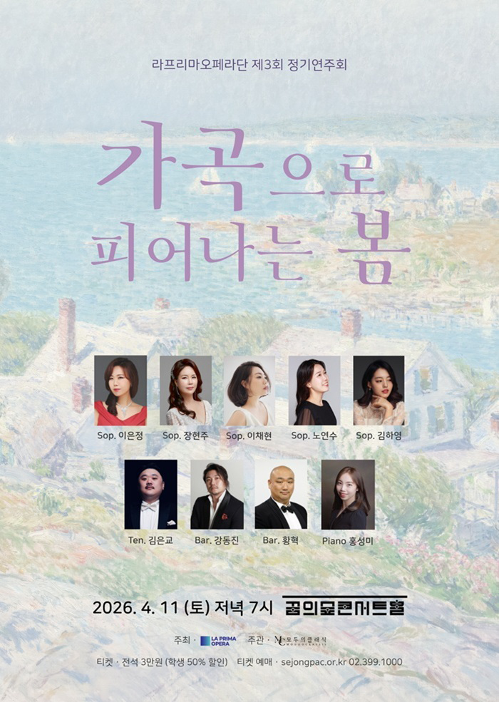 [Concert Introduction] Just as warm air permeates the earth that has been huddled up all winter, spring has arrived by our side. This concert, **<Spring Blooming Through Art Songs>**, has been prepared to capture the excitement of the season in beautiful vocal melodies. In Part 1, we sing of the spring of our hometown and the scent of flowers through Korean art songs that blend our poetry and melodies. In the following Part 2, we unfold the narratives of deep passion and love inherent in classical music through opera arias and duets by masters such as Mozart and Verdi. We hope this will be a time when the vibrant spirit of spring blossoms in your hearts, accompanied by the vocalists' voices resonating like blooming flower petals. [PROGRAM] Part 1 Sop. Kim Ha-young: One Spring Day - Poem by Hwang Be-dro, Selected by Jung Hee Baro. Kang Dong-jin: I Shall Live in the Green Mountains - Poem by Kim Yeon-jun, Music Sop. Lee Eun-jeong Sanyuhwa - Poem by Kim So-wol, Music by Kim Seong-tae Sop. Lee Chae-hyun Saetaryeong - Poem by Park Hee-kyung, Music by Jo Du-nam Sop. Jang Hyun-ju In the Flower Clouds - Poem by Park Du-jin, Music by Lee Heung-ryeol Ten. Kim Eun-kyo Gagopa - Poem by Lee Eun-sang, Music by Kim Dong-jin Sop. Lee Eun-jeong Sop. Lee Chae-hyun First Love - Poem and Music by Kim Hyo-geun Part 2 Bar. Hwang Hyeok Caro mio ben - G. Giordani Sop. No Yeon-su La Capinera - J. Benedict Sop. Kim Ha-young, Bar. Hwang Hyeok W. A. Mozart - Opera <Die Zauberflöte> Bei Männern, welche Liebe fühlen (Those who feel love) Sop. Jang Hyun-ju. Bar. Kang Dong-jin Franz Lehár - Lippen Schweigen (Lips are Silent) From the Operetta Die lustige Witwe Sop. No Yeon-su, Ten. Kim Eun-kyo G. Verdi - Opera <Rigoletto> Signor né principe... È il sol dell'anima All Cast As Spring Comes Across the River - Poem by Song Gil-ja, Music by Im Geung-su