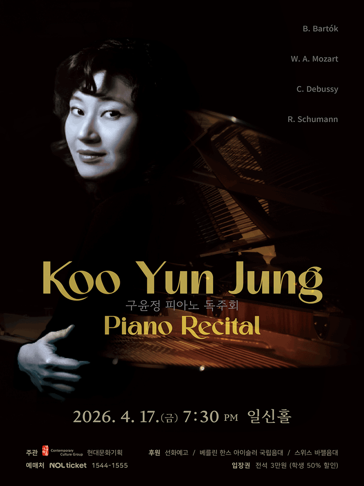 [PROGRAM] B. Bartók (1881-1945) 3 Hungarian Folk Songs From The Csík District, Sz. 35a (1907) 1. The Peacock. Rubato 2. Jánoshdia fairground. L’istesso Tempo 3.White Lily. poco vivo W. A. Mozart (1756-1791) Sonata No. 15 in F Major, K. 533/494 (1788) Ⅰ. Allegro Ⅱ. Andante Ⅲ. Rondo C. Debussy (1862~1918) Mazurka (1890) Valse romantique (1890) D’un cahier d’esquisses (From a Sketchbook) (1904) L'isle joyeuse (1904) - INTERMISSION - R. Schumann (1810~1856) Humoreske.20 (1839) Movement 1: Einfach (Simply) Movement 2: Hastig (Hastely) Movement 3: Einfach und zart (Simply and gently) Movement 4: Innig (Sincerely, intimately) Movement 5: Sehr lebhaft (Very lively) - Stretto, Immer lebhafter (Stretto, even more lively) Movement 6: Mit einigem Pomp (With a splendidness) (with) Song 7: (Zum Beschluss)