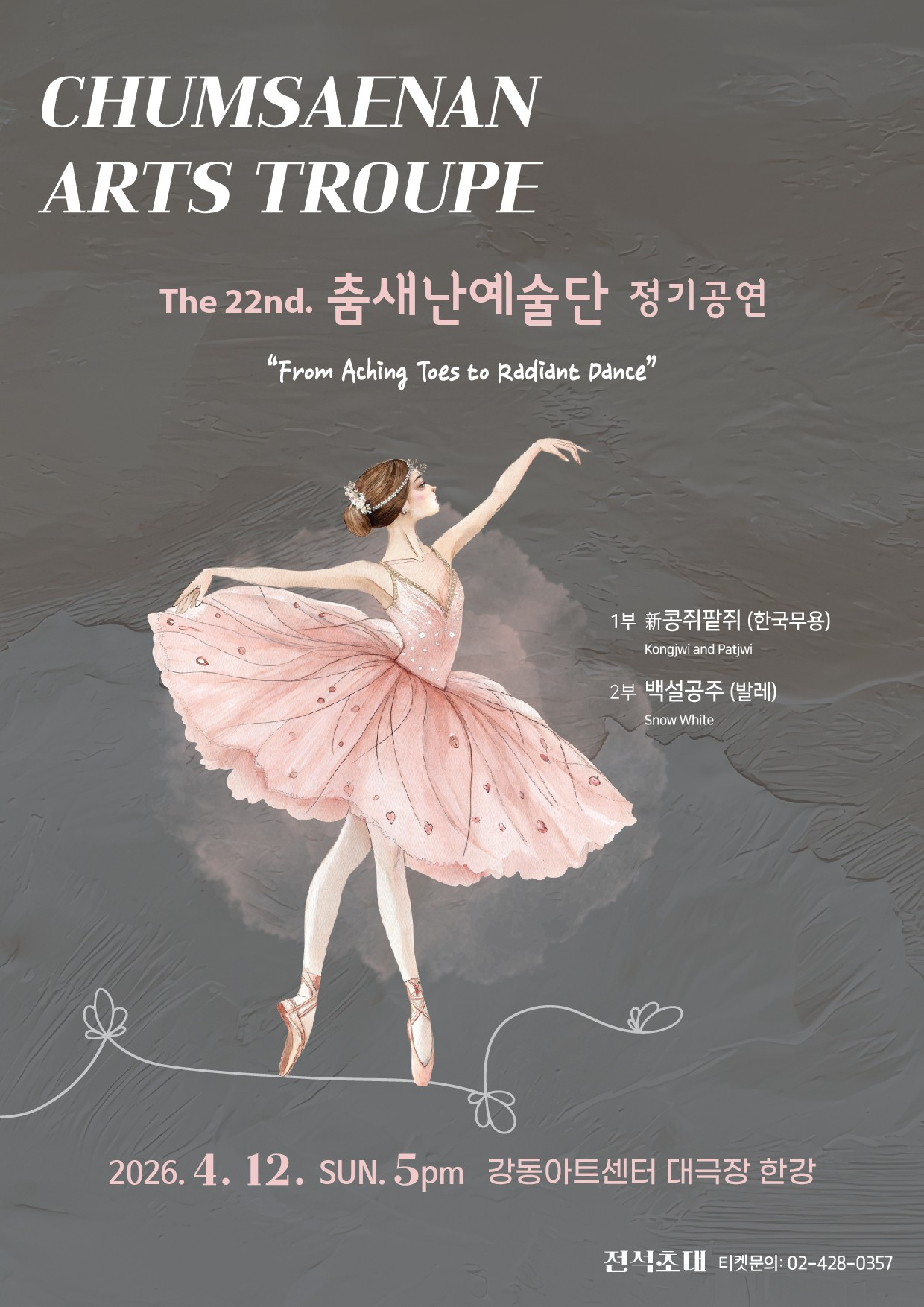[Performance Introduction] Embracing the meaning of 'Saenan,' a pure Korean word signifying a new leap forward, this performance aims to express the challenge and ideals of venturing into new territory. Through a collaboration between a junior dance company possessing pure and clear souls and professional dancers, we seek to recreate a space for communication that everyone can relate to by prompting us to reflect on our rapidly changing society and conveying a message of hope. Part 1: Korean Dance: Kongjwi and Patjwi (Yellow Beans and Red Beans) - A Story Filled with Hope (70 mins), Intermission (10 mins) Part 2: Ballet: Snow White (70 mins)